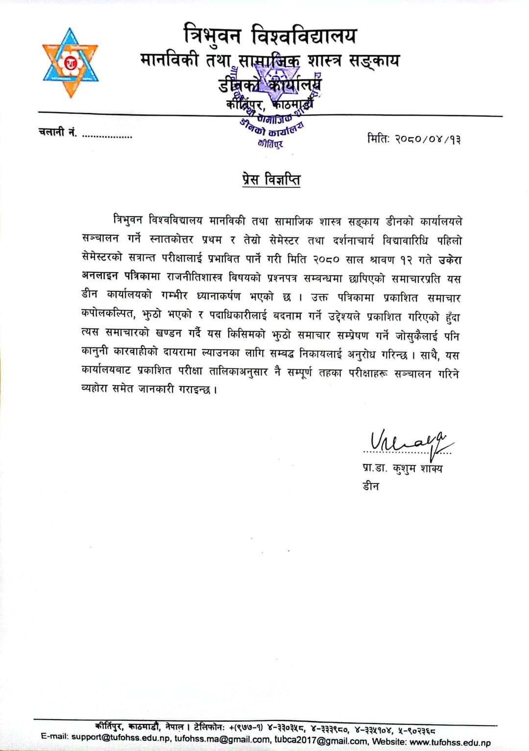 BCA कार्यक्रम अन्तर्गत छैटौं सेमेस्टर (BATCH 2022) को सत्रान्त परीक्षाको परीक्षा केन्द्र प्रकाशित गरिएको सम्बन्धमा ।