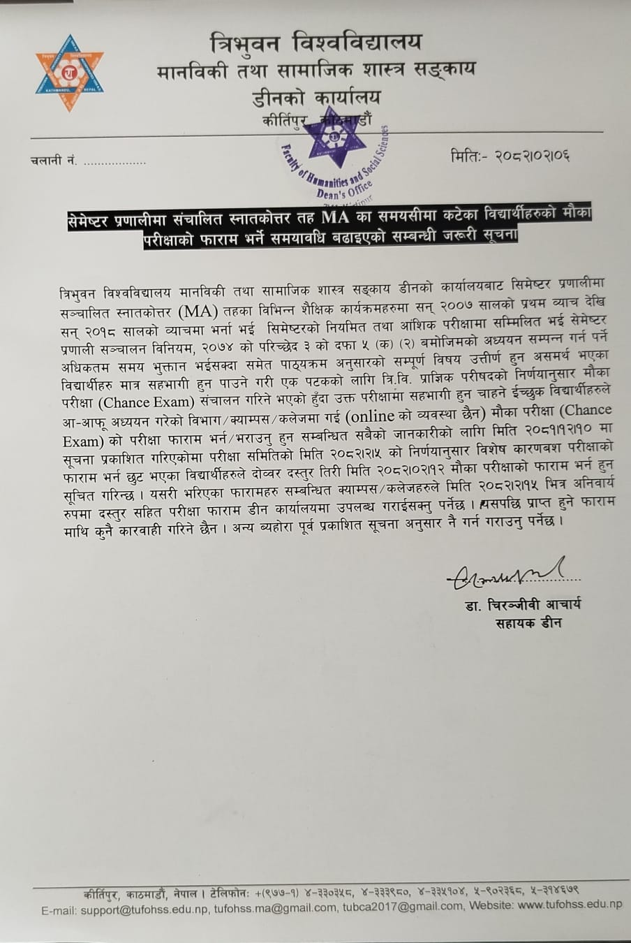 सेमेस्टर प्रणाली अन्तर्गत सञ्चालित स्नातकोत्तर तह (MA) को मौका परीक्षा फाराम भर्ने म्याद थप सम्बन्धी सूचना ।