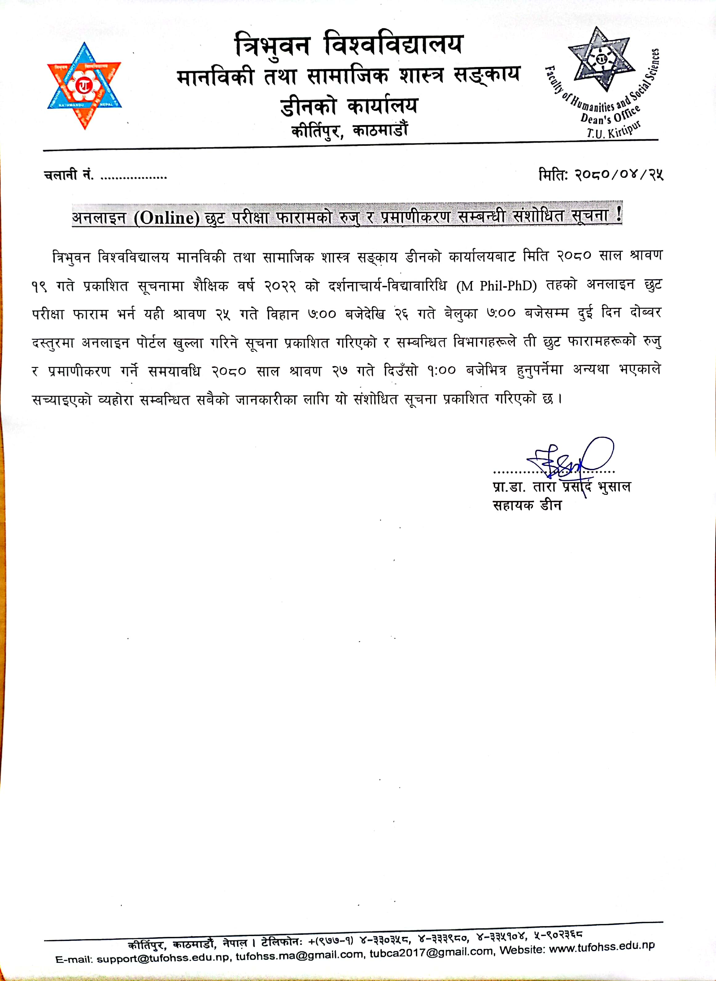 BCA कार्यक्रम अन्तर्गत छैठौं सेमेस्टरको छुट परीक्षा फाराम अनलाइन भर्ने सम्बन्धि जरुरी सूचना ।