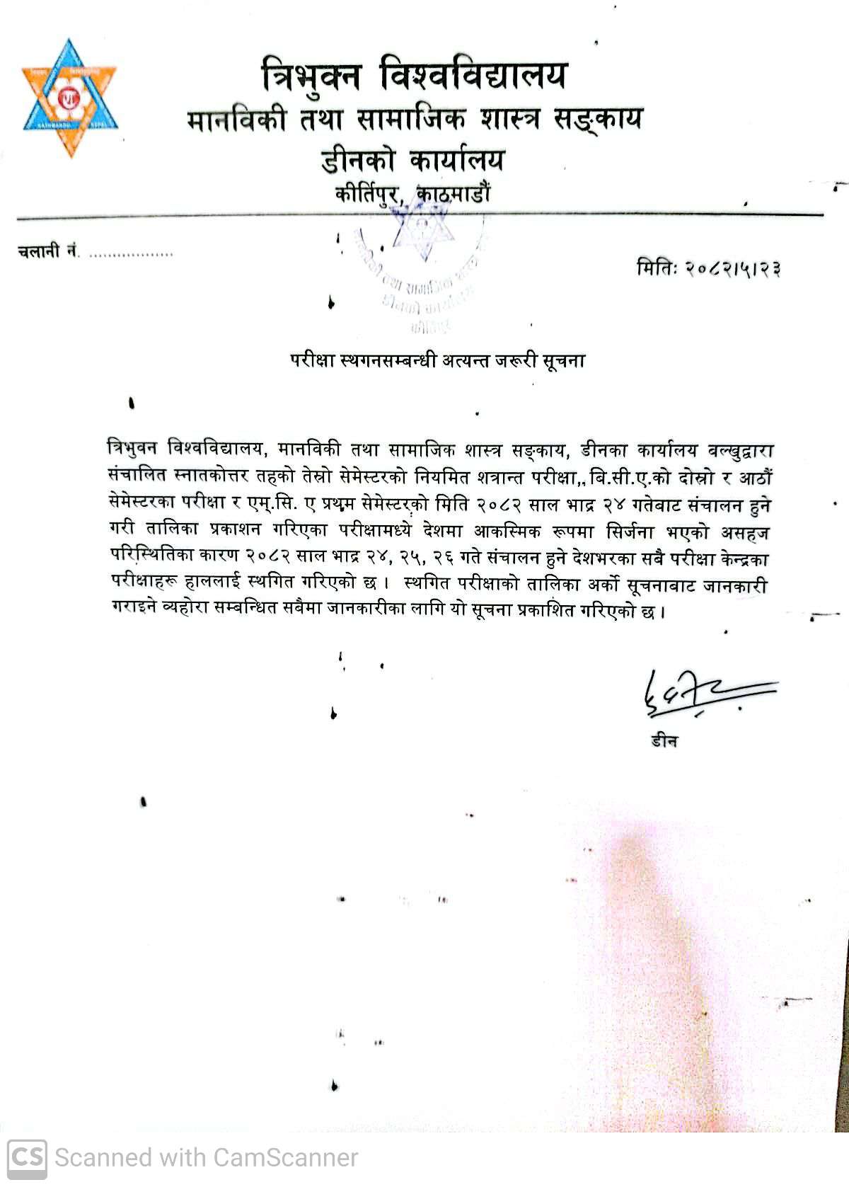 परीक्षा स्थगित गरिएको अत्यन्त जरुरी सूचना