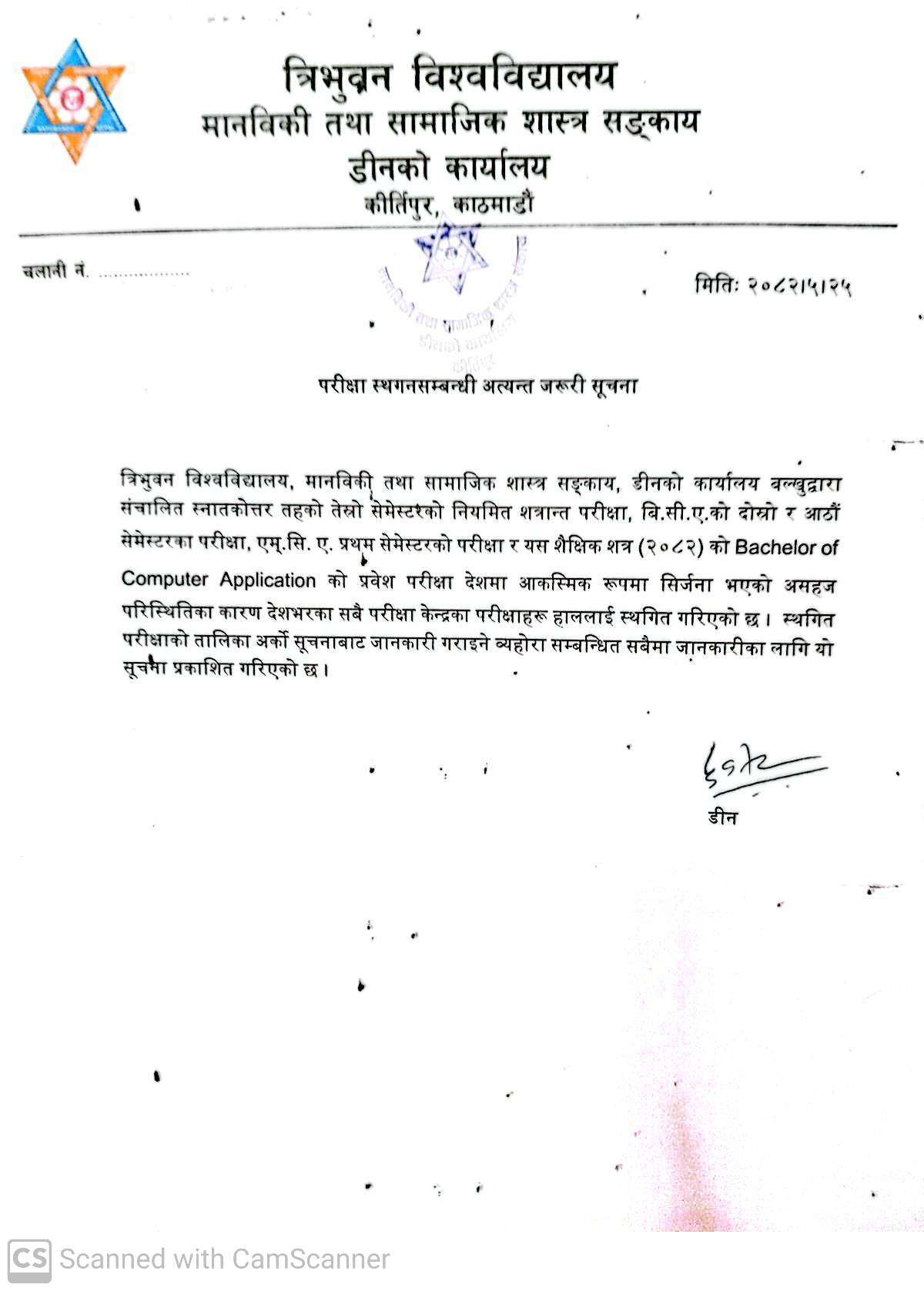अर्को सूचना प्रकाशित नभए सम्म को लागि परीक्षा स्थगित गरिएको बारे अत्यन्त जरुरी सूचना
